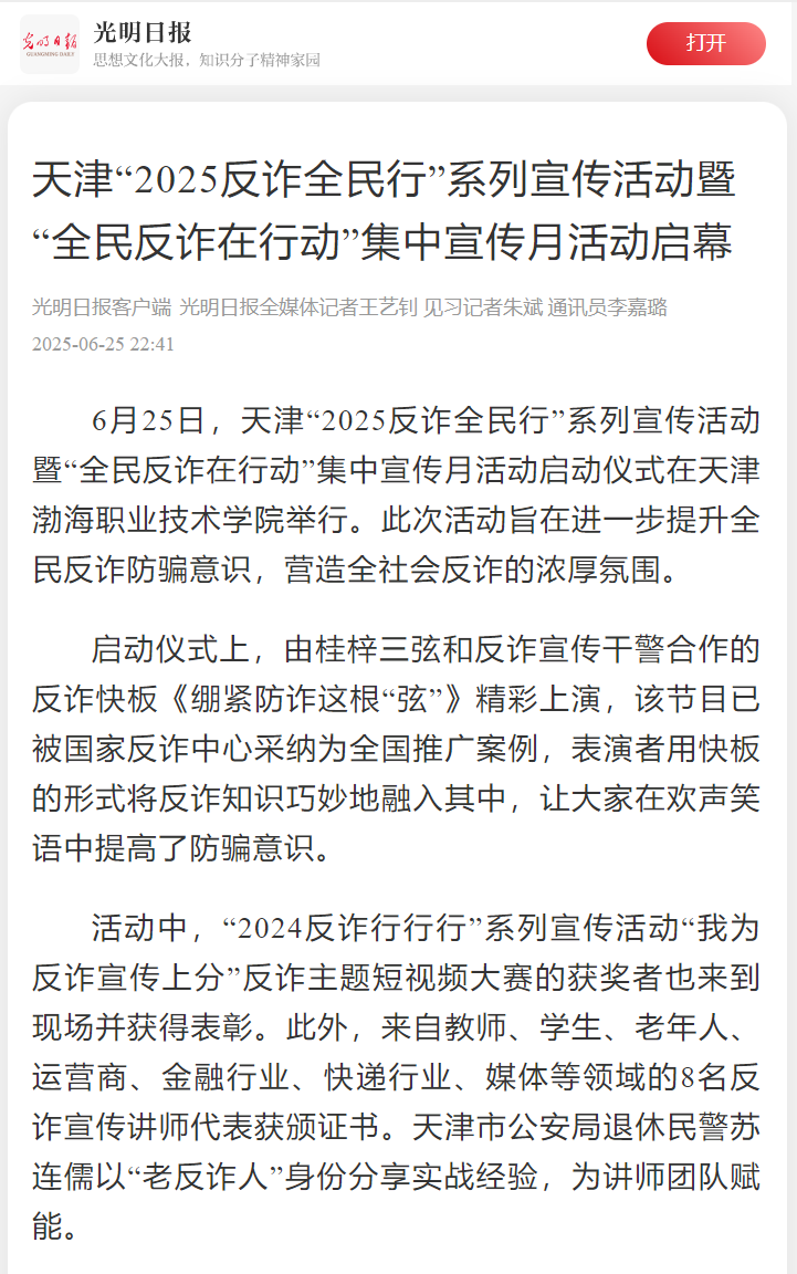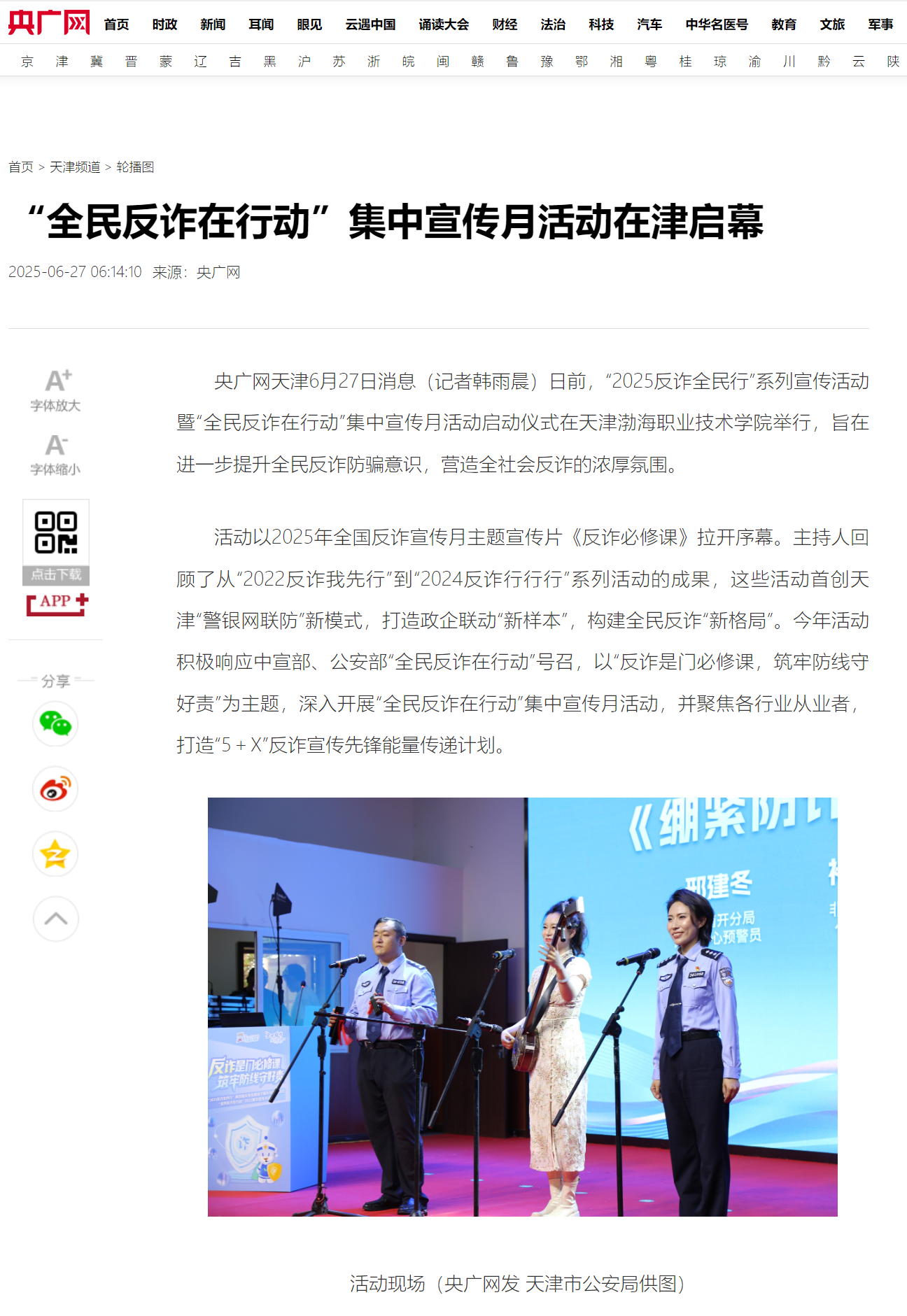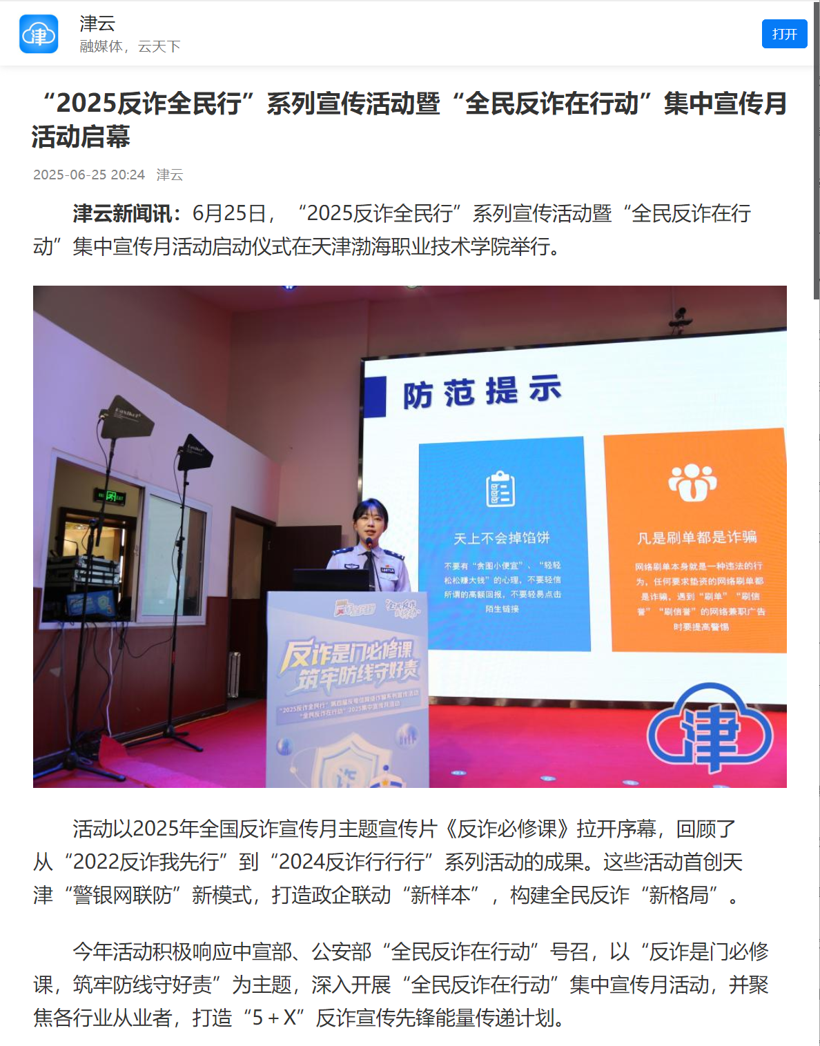 近日,天津“2025反诈全民行”系列宣传活动暨“全民反诈在行动”集中宣传月活动启动仪式在天津渤海职业技术学院举行,获得光明日报、央广网、中国网、法治日报社、网易新闻、腾讯新闻、搜狐新闻、天津日报、今晚报、津云等多家媒体报道。