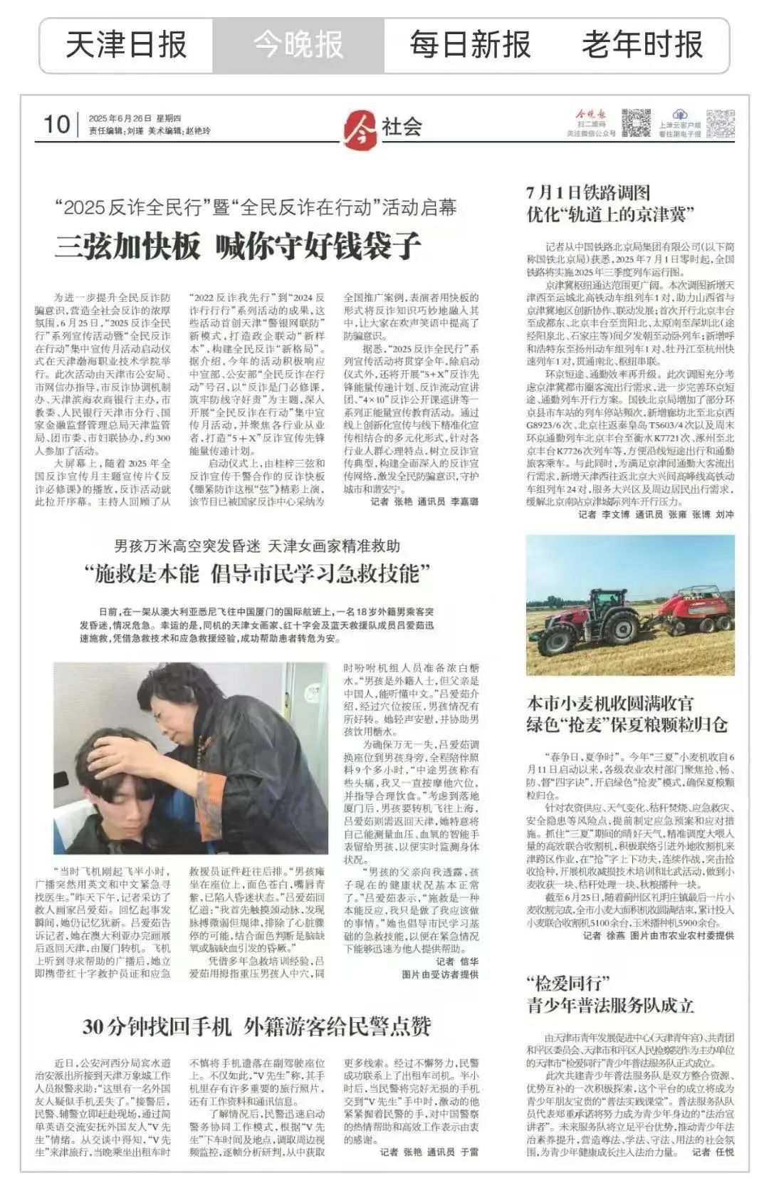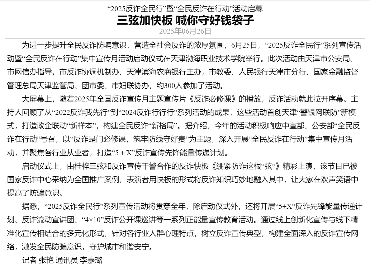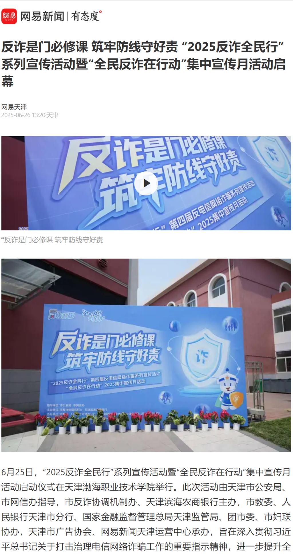 近日,天津“2025反诈全民行”系列宣传活动暨“全民反诈在行动”集中宣传月活动启动仪式在天津渤海职业技术学院举行,获得光明日报、央广网、中国网、法治日报社、网易新闻、腾讯新闻、搜狐新闻、天津日报、今晚报、津云等多家媒体报道。
