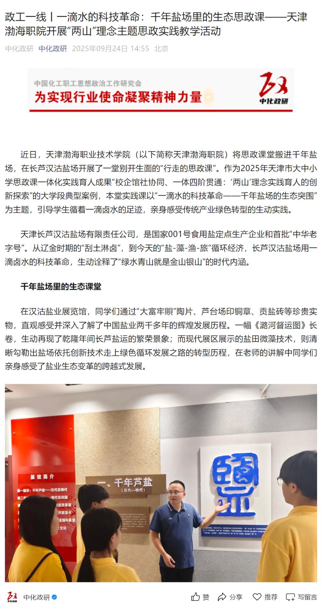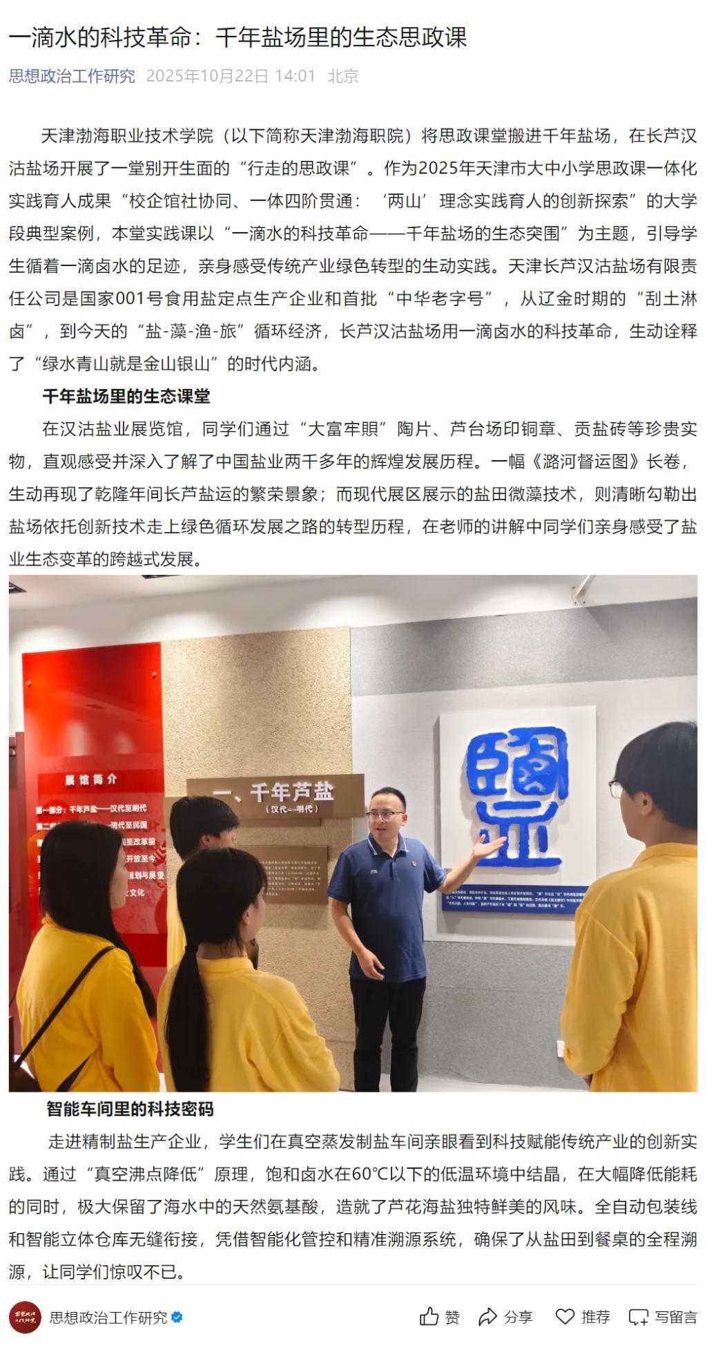 近日,学院一堂别开生面的“行走的思政课”获得思想政治工作研究、中化政研会等公众号及天津教育报等权威媒体的集中报道。该课程将思政课堂搬进拥有千年历史的天津长芦汉沽盐场,让学生在真实的生产场景中,感受“一滴水的科技革命”,理解“绿水青山就是金山银山”的深刻内涵。